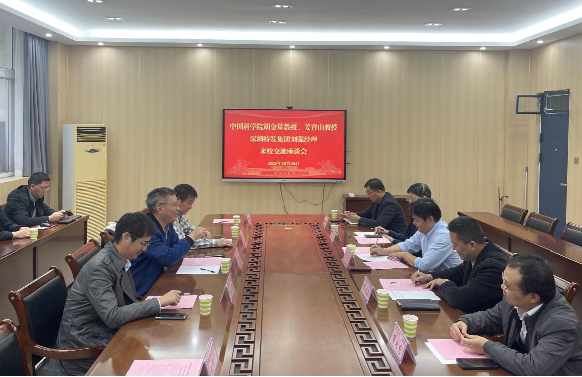 10 月 16 日下午,中国科学院先进技术研究院胡金星教授、姜青山教授、深圳特发集团特发信息股份公司新基建事业部经理刘强一行来校考察交流。座谈会在办公楼303会议室举行,副校长李波出席会议并致辞,教务处、发展规划处、信息工程学院、软件学院等相关单位负责人参会,会议由科研处处长李光喜主持。